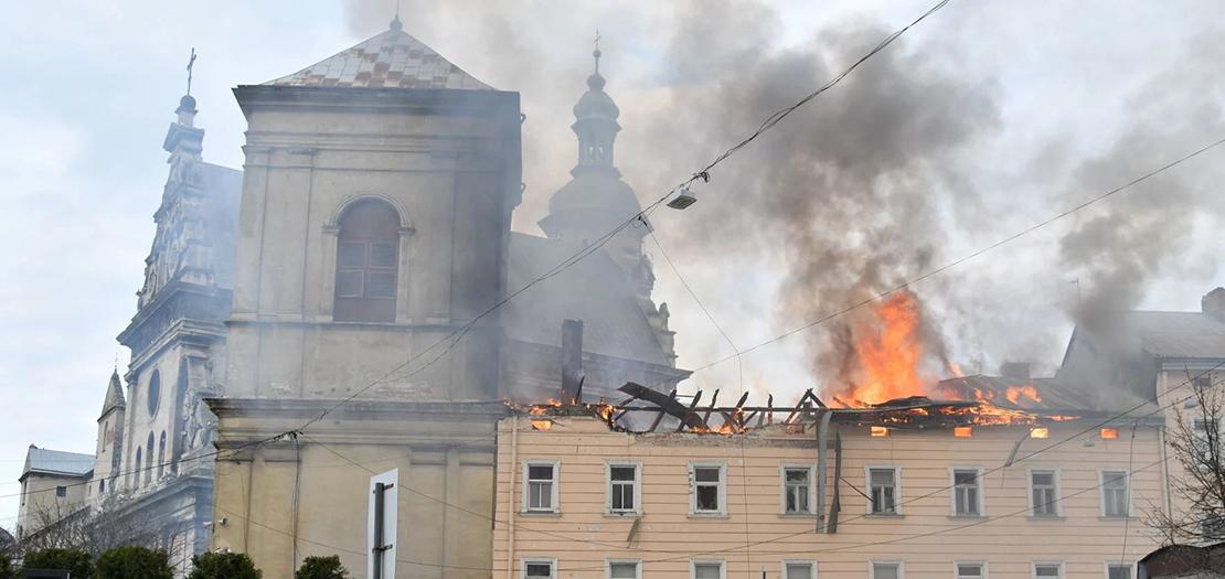 وأكدت السلطات المحلية في لفيف أن مباني سكنية تاريخية قرب الدير الذي يعود إلى القرن السادس عشر -والواقع ضمن المركز التاريخي للمدينة المُدرج على قائمة اليونسكو للتراث العالمي- قد أصيبت واشتعلت فيها النيران، كما تضرّر برج الدير.