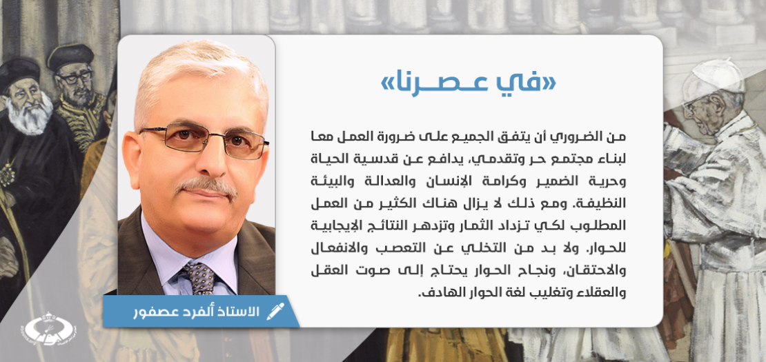 من الضروري أن يتفق الجميع على ضرورة العمل معا لبناء مجتمع حر وتقدمي، يدافع عن قدسية الحياة وحرية الضمير وكرامة الإنسان والعدالة والبيئة النظيفة. ومع ذلك لا يزال هناك الكثير من العمل المطلوب لكي تزداد الثمار وتزدهر النتائج الإيجابية للحوار. ولا بد من التخلي عن التعصب والانفعال والاحتقان، ونجاح الحوار يحتاج إلى صوت العقل والعقلاء وتغليب لغة الحوار الهادف.
