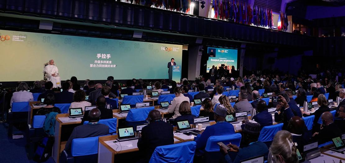 وخلال كلمته أمام المشاركين، أعرب الأب الأقدس عن امتنانه العميق للدعوة، مؤكدًا أن زيارته تأتي استلهامًا من أسلافه على كرسي بطرس، الذين أولوا المنظمة تقديرًا خاصًا لما تقوم به من جهود دولية لتعزيز الأمن الغذائي والتنمية الزراعية. ووجّه البابا تحية احترام وتقدير لجميع الحاضرين، معبّرًا عن أمنيته بأن يسود السلام في العالم، وأن يكون القضاء على الجوع الشرط الأول لتحقيق هذا السلام.