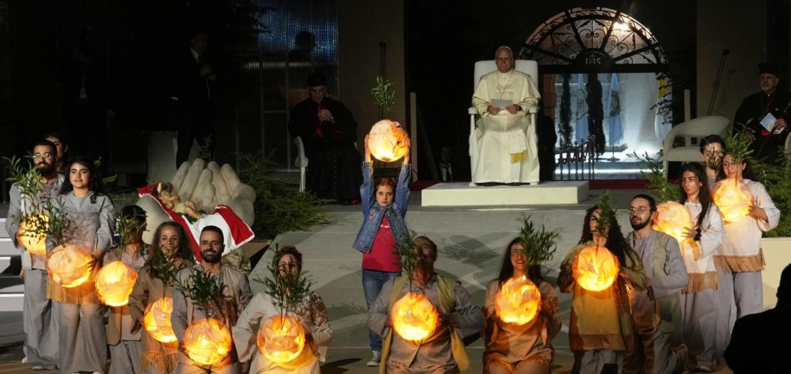 وفي بداية اللقاء، قدّمت الشبيبة عرضًا مسرحيًا عبّر عن آمالهم وتطلعاتهم -تضمن العرض ترانيم روحية وخبرات حياة- وكان قد أظهر العرض المسرحي روح الشباب المتفائل والإيجابي. وقدمت الشبيبة إلى البابا رموزًا تعبّر عن المآسي والآلام التي خلفها انفجار مرفأ بيروت والجروح التي لم تلتئم بعد.