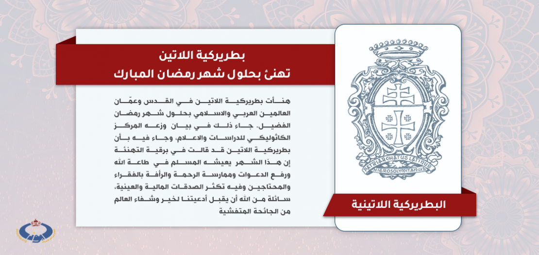 هنأت بطريركية اللاتين في القدس وعمّان العالمين العربي والاسلامي بحلول شهر رمضان الفضيل، وجاء ذلك في بيان وزعه المركز الكاثوليكي للدراسات والاعلام وجاء فيه بأن بطريركية اللاتين قد قالت في برقية التهنئة إن هذا الشهر يعيشه المسلم في طاعة الله ورفع الدعوات وممارسة الرحمة والرأفة بالفقراء والمحتاجين وفيه تكثر الصدقات المالية والعينية.