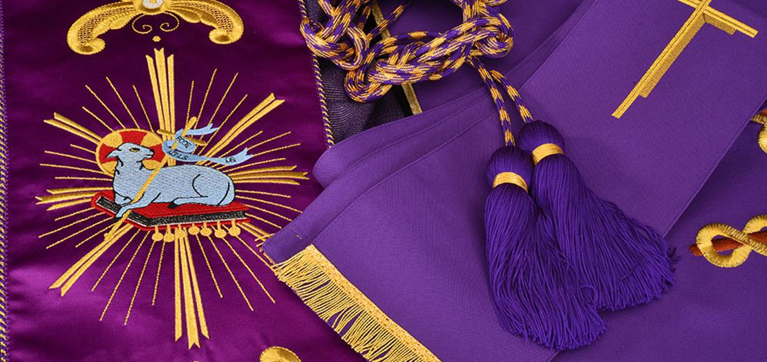 خلال زمن الصوم الكبير، اعتاد الكهنة ارتداء الثياب الليتورجية ذات اللون البنفسجي (الأرجواني). وقد تدرّج اعتماد هذا التقليد عبر القرون، إذ كان اللون الأبيض هو المستخدم في البدايات، قبل أن يتطوّر نظام الألوان الليتورجية ويُثبَّت رسميًا في الكنيسة.