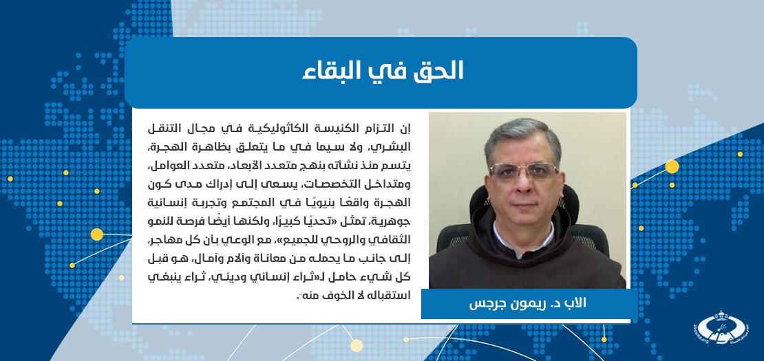 وبالتالي، فإن كرامة الشخص البشري في التعليم الاجتماعي الكاثوليكي تستند إلى حقائق طبيعية ومُعلنة. فالبشر عقلانيون، لديهم ذكاء وإرادة، وبالتالي هم أحرار. هذا هو العنصر الطبيعي الذي يُظهر كرامة الإنسان. ولكن هناك عنصر أعمق، وهو ما يُكشف في الوحي الإلهي، حيث نتعلم أن الرجل والمرأة خُلقا على صورة الله ومثاله، وفُديا بواسطته. فالبشر ثمينون جدًا في نظر الله، حتى أن ابنه الوحيد سفك دمه من أجلهم. وهذا هو العنصر المُعلن من كرامة الإنسان، الذي يُضفي طابعًا إلهيًا على الطبيعة البشرية. ويُشكّل هذا المفهوم لكرامة الإنسان الأساس لقائمة الحقوق والواجبات في السلام على الأرض، والتي تتراوح من الحق في الحياة إلى الحقوق السياسية. ومن بين هذه الحقوق الأساسية نجد "الحق في البقاء". ويُعبّر البابا يوحنا الثالث والعشرون عن ذلك بقوله: "لكل إنسان الحق في حرية التنقل والإقامة ضمن حدود دولته الخاصة." (يوحنا الثالث والعشرون، 1963، فقرة 25). وعلى الرغم من أن هذا التصريح واسع جدًا، إلا أن جوهره يكمن في فهم أن الناس لا ينبغي أن يُجبروا على مغادرة وطنهم الأصلي، ويجب أن يُسمح لهم بالعودة إذا غادروه. وفي جزء لاحق من نفس الرسالة العامة، يُشير البابا إلى وضع اللاجئين الذين أُجبروا على مغادرة بلادهم بسبب الأنظمة التوتاليتارية القمعية. ويُوضح البابا: "إن المشاعر العميقة من المحبة الأبوية للبشرية جمعاء، التي غرسها الله في قلبنا، تجعل من المستحيل علينا أن ننظر دون ألم شديد إلى محنة أولئك الذين نُفوا من أوطانهم لأسباب سياسية. هناك أعداد كبيرة من هؤلاء اللاجئين في الوقت الحاضر، وكثير منهم يُعاني – المعاناة التي لا تُصدّق – والتي يتعرضون لها باستمرار. وهنا، بالتأكيد، دليلنا على أنه، في تحديد نطاق الحرية العادلة التي يمكن أن يعيش فيها المواطنون حياة تليق بكرامتهم الإنسانية، فإن حكّام بعض الدول كانوا متشددين للغاية. ففي بعض هذه الدول، يُشكك في الحق ذاته في الحرية، بل يُنكر تمامًا. وهنا نجد انقلابًا كاملًا في النظام الصحيح للمجتمع، إذ إن الغاية الأساسية للسلطة العامة هي حماية مصالح الجماعة. وواجبها السيادي هو الاعتراف بالمجال النبيل للحرية وحماية حقوقه". وفي هذا المقطع أيضًا، يُدين البابا يوحنا الثالث والعشرون وضع اللاجئين والمنفيين الذين أُجبروا على مغادرة منازلهم من قبل الدول الاستبدادية. ويُعالج هذه القضية في سياق الخير العام العالمي، والحاجة إلى التضامن الفعّال بين الدول والمجتمعات الوسيطة والمواطنين. فمحنة اللاجئين تُعد تقييدًا للحق الأساسي في الحرية من قبل السلطة التي من المفترض أن تخدم وتحمي مواطنيها. ويجب أن يكون المواطنون والمجتمعات الوسيطة والدول الأخرى مستعدين للتعاون في رعاية اللاجئين، بصفتهم أعضاء في الأسرة الإنسانية العالمية. ومن المهم ملاحظة كيف يربط البابا فكرة الحرية بـ"الحق في البقاء" في الوطن، وبازدهار الإنسان ومبدأ كرامته. فالحق في عدم إجبار الإنسان على الهجرة يستند إلى كرامته الإنسانية.