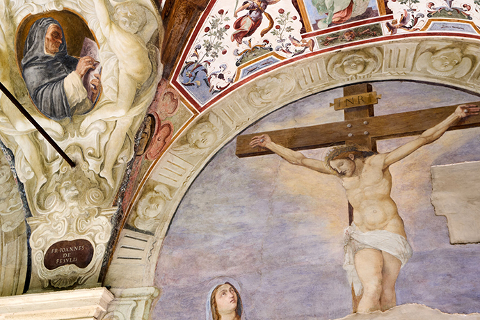 وتُظهر بعض اللوحات الجدارية التي تزيّن الجدران والأسقف المقوّسة أسرار المسبحة الوردية، وقد صُمّمت لتشجيع حياة التأمل لدى الرهبان الدومينيكان. بينما تكشف لوحات أخرى، موزّعة في الزوايا والمداخل، عن تاريخ مضطرب شهدته هذه المساحة.