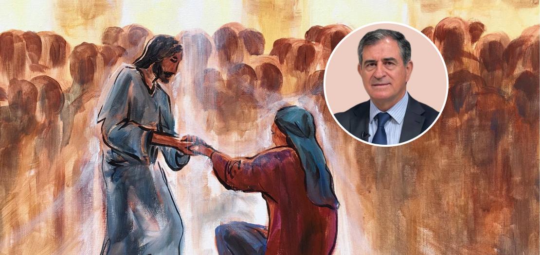 • الوصف: كانت الجموع تزاحم يسوع، وامرأة مريضة منذ اثني عشر عامًا تقدّمت ولمست هدب ثوبه فشُفيت في الحال.