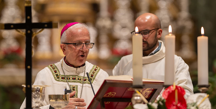 في مستهل عظته، تقدّم المطران شوملي بالشكر لسفارة فلسطين لدى الكرسي الرسولي على دعوتها لترؤس هذا القدّاس والمشاركة في افتتاح معرض «بيت لحم تولد من جديد»، معربًا عن امتنانه العميق للدول التي أسهمت بسخاء في دعم ترميم كنيسة المهد، الأمر الذي أتاح لهذا الموقع المقدّس استعادة رونقه التاريخي ومواصلة إشعاعه كمنارة للإيمان والرجاء.