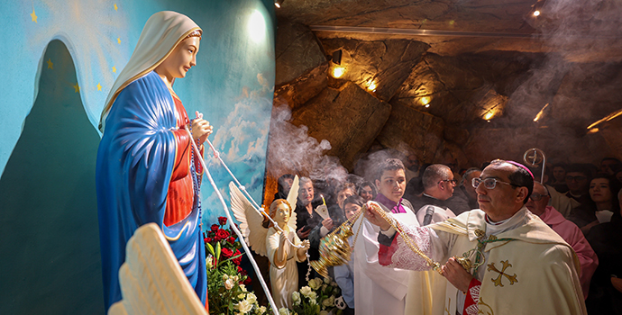 وبعد القداس الإلهي وعلى وقع المعزوفات الكشفية والتراتيل المريمية، قام المطران الطوال يرافقه كاهن الرعية ولفيف الكهنة بتدشين المزار الجديد، مزار مريم العذراء حلّالة العُقد، بحضور غفير من أبناء الرعية الذين التفوا حول الأم البتول رافعين الشموع وناثرين الورود، مع طالبات مدرسة الرعية، وحناجرهم تصدح بتحية العذراء: سلام سلام لك يا مريم.