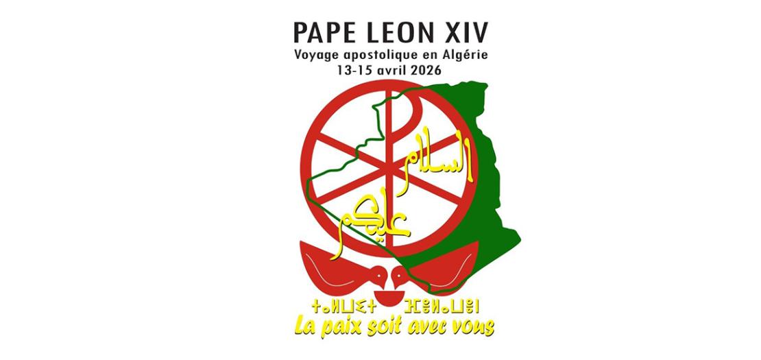 يستوحى شعار زيارة البابا لاون الرابع عشر إلى الجزائر، المقرّرة من 13 إلى 15 نيسان المقبل، من نقش بارز قديم، يُظهر حمامتين تشربان من كأس واحدة، رمز السلام والوئام، بالإضافة إلى أحد أقدم الرموز المسيحية ☧ المكوّن من تداخل الحرفين اليونانيين الأولين ΧΡΙΣΤΟΣ «خريستوس» التي تعني «المسيح»، مدمجًا مع خريطة الجزائر.