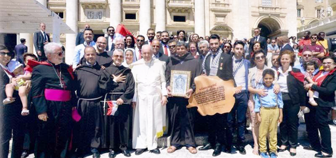 عقد اول اجتمع هام في روما، في ساحة القديس بطرس، برئاسة اسقف غروسيتو رودولفو شيتولوني، حيث استقبلنا قداسة البابا فرنسيس. وقد غمرنا الاب الاقدس بالسعادة عندما اتى وشاركنا في التقاط الصورة ومنحنا بركته، لمواصلة مسيرة"الفرح الدائم" التي خلفها البابا للعالم اجمع. وقمنا بتقديم هدية ثمينة الى قداسة البابا، عبارة عن ايقونة تمثل اللقاء التاريخي بين القديس فرنسيس والسلطان من اناج مشغل خاص بالصدف في بيت لحم، وذلك من خلال اسلوب يعود الى 250 عاما الى الوراء حملناها بكبرياء باهر – هي بحق تحفة فنية!