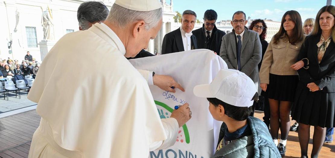 خلال المقابلة العامة يوم الأربعاء، بارك البابا لاون الرابع عشر ووقّع على علم يحمل الشعار الرسمي لليوم العالمي للأطفال لعام 2026.