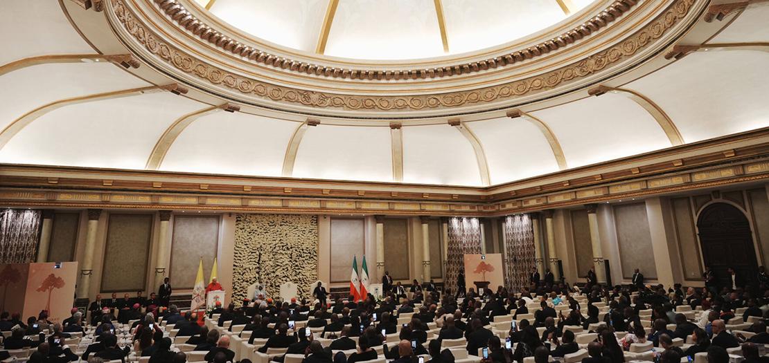 أحيّيكم بمودّة، وأشكركم على حُسن استقبالكم وعلى كلامكم الذي وُجَّهتموه إليّ. ويسعدني أن أكون هنا لزيارة شعب غينيا الاستوائيّة الحبيب. عندما زار القدّيس البابا يوحنا بولس الثّاني بلدكم سنة 1982، وصفكم، السّيّد الرّئيس، بأنّكم "المركز الرّمز الذي تتلاقى فيه تطلّعات الشّعب الحيّة من أجل إرساء مناخٍ اجتماعيّ من حرّيّةٍ أصيلة، وعدلٍ، واحترامٍ وتعزيزٍ لحقوق كلّ شخصٍ أو مجموعة، وظروفٍ معيشيّة أفضل تُمكّن الجميع من أن يحقّقوا أنفسهم كبشرٍ وكأبناءٍ لله" (القدّيس يوحنا بولس الثّاني، كلمة إلى رئيس غينيا الاستوائيّة، مالابو). إنّه كلام نعيشه الآن، ويُخاطب كلّ من أُنيطت به مسؤوليّات عامّة. من جهة أخرى، "إنّ آمالَ البشرِ وأفراحَهم، وأحزانَهم وضيقاتهم، في زمننا هذا، لا سيّما الفقراء منهم والمعذَّبين جميعًا، هي أفراحُ تلاميذِ المسيح وآمالُهم، وأحزانُهم وضيقاتهم. وهل من شيءٍ إنسانيٍّ حقّ إلّا وله صداهُ في قلوبهم؟" (الدّستور الرّعائي، في الكنيسة في عالم اليوم، فرح ورجاء، 1). هذه التّعابير من الدّستور الرّعائي، فرح ورجاء، الصّادر عن المجمع الفاتيكانيّ الثّاني، تعبّر أحسن تعبير عن الأسباب والمشاعر التي تقودني إليكم، لأثبّتكم في الإيمان وأعزّي شعب هذا البلد الذي يشهد تحوّلًا سريعًا. في قلب الله، وفي قلب الكنيسة، يتردّد صدى ما يحدث هنا، بين ملايين الرّجال والنّساء الذين بذل ربّنا يسوع المسيح حياته من أجلهم.