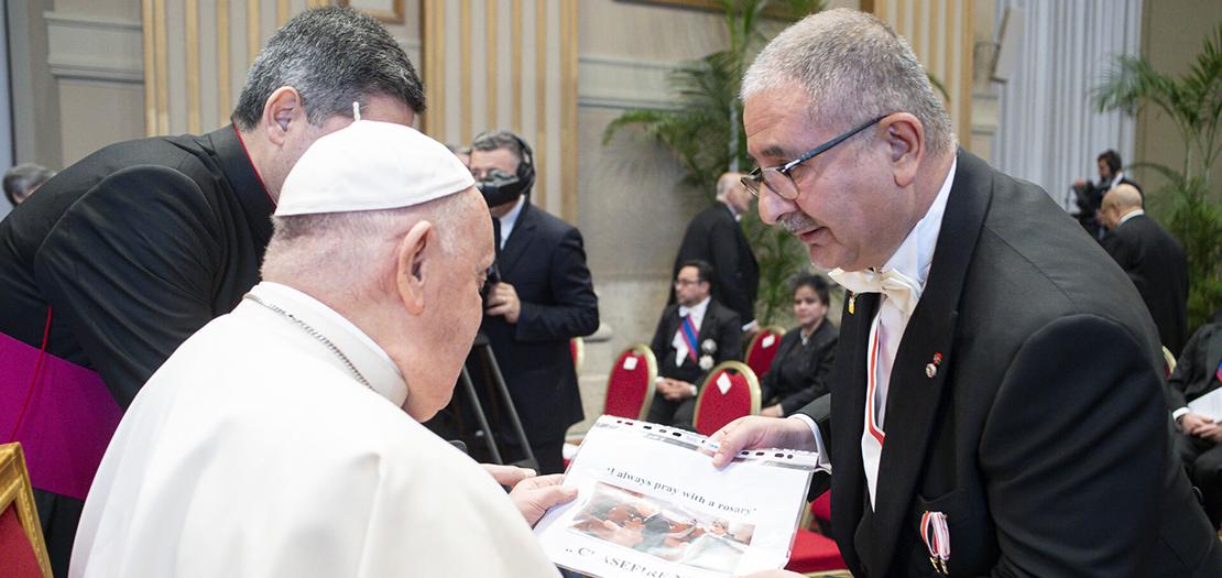وفي هذه المناسبة، أودّ أن أبدأ حديثي عن زيارته وحجه إلى الأرض المقدسة، هذه الزيارة التي قام بها بعد فترة وجيزة من انتخابه وإعتلائه السدة البطرسية. فمنذ اللحظة الأولى لوصوله إلى أرض الوطن، قادمًا من الأردن عبر طائرة مروحية –بعد إنجازه برنامج حافل في المملكة الأردنية الهاشمية ولقائه جلالة الملك عبدالله الثاني وزيارته إلى المغطس- قدّم قداسة البابا فرنسيس إشارة رمزية ذات دلالات سياسية ومعنوية عميقة. فقد اختار الوصول مباشرة إلى مدينة الميلاد، بيت لحم، دون المرور عبر إسرائيل، في خطوة عُدّت مؤشرًا مبكرًا على توجهه نحو الاعتراف بدولة فلسطين. وبالنسبة لنا كانت هذه محطة مهمة في تاريخنا.