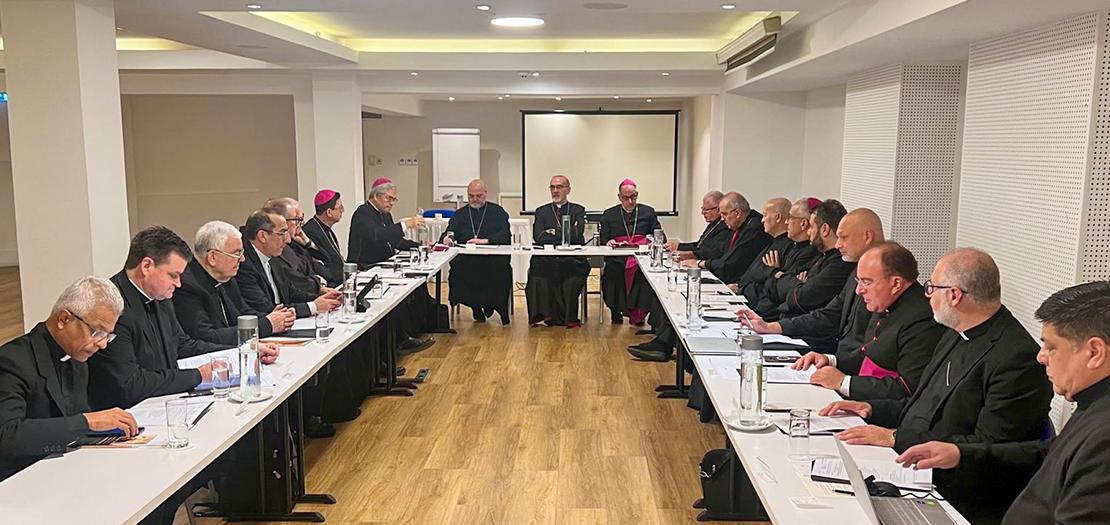 تركّز الجزء الأوّل من الاجتماع على مختلف جوانب الصراعات الدائرة في المنطقة وتأثيراتها على حياة جماعاتنا المسيحية وقطاعات العمل الراعوي والعائلات والجماعات الرهبانية والمدارس؛ سواء من ناحية الأمور العملية (كالتأشيرات، والتصاريح، والعمل، والحدود، وغيرها)، أو من ناحية انعكاساها على الحياة الروحية والمعنوية في كنائسنا، وعلى العلاقات المسكونية والحوار بين الأديان. كما ناقشنا كيفية استجابة مؤسساتنا لهذه التحدّيات وما يُنتظر منّا في هذه المرحلة الجديدة الظاهرة.